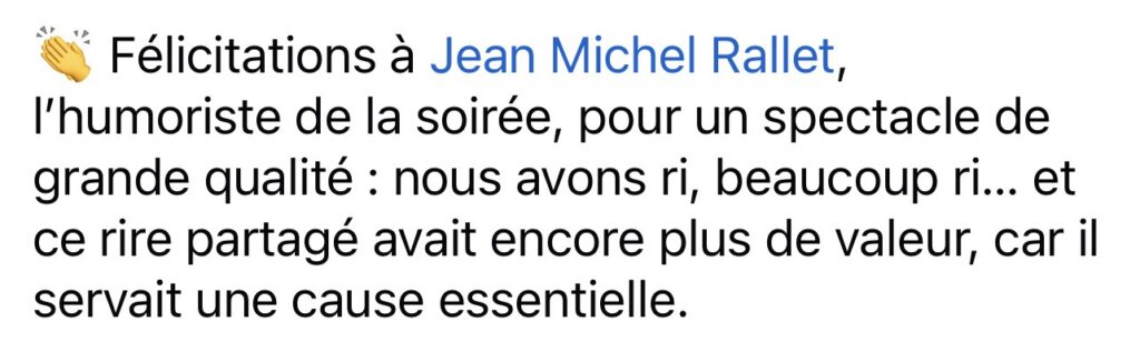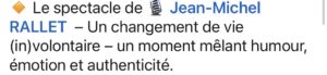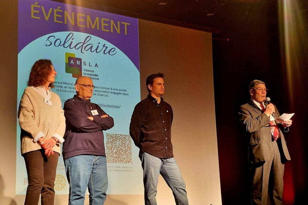 ✔️ Jouer ce soir au profit de la recherche contre la Maladie de Charcot est une idée née au bar à côté du théâtre Nombril du Monde où je jouais en 2025. Comme à mon habitude, je discute autour d’un verre avec les spectateurs et je parle à Isabelle Tréton de mes soirées « Rire Solidaire »… l’idée fait son chemin. L’équipe du Rotary « Valence Mistral » vient me voir à Saint Vallier… on trouve une date… la mairie de Guilehrand Grange met à disposition l’AGORA et nous sommes plus de 200 le 19 Février pour soutenir la cause.